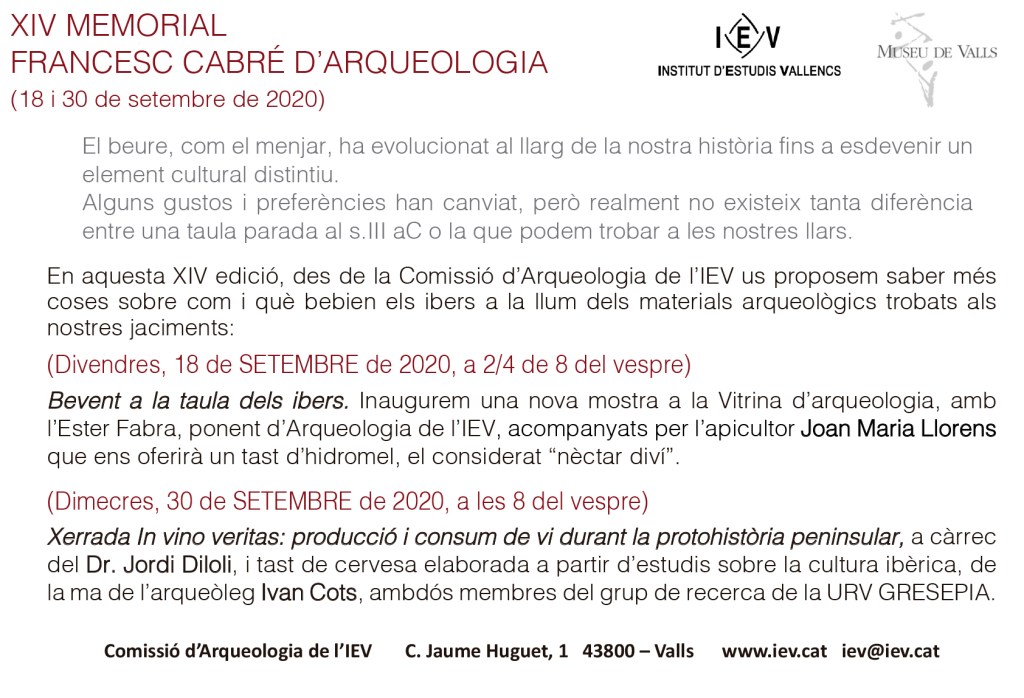 Divendres 18 de setembre a 2/4 de 8 del vespre: Bevent a la taula dels ibers. Una nova proposta de la Vitrina d’arqueologia que inaugurarem amb l’Ester Fabra, ponent d’Arqueologia de l’IEV, i un tast d’hidromel.